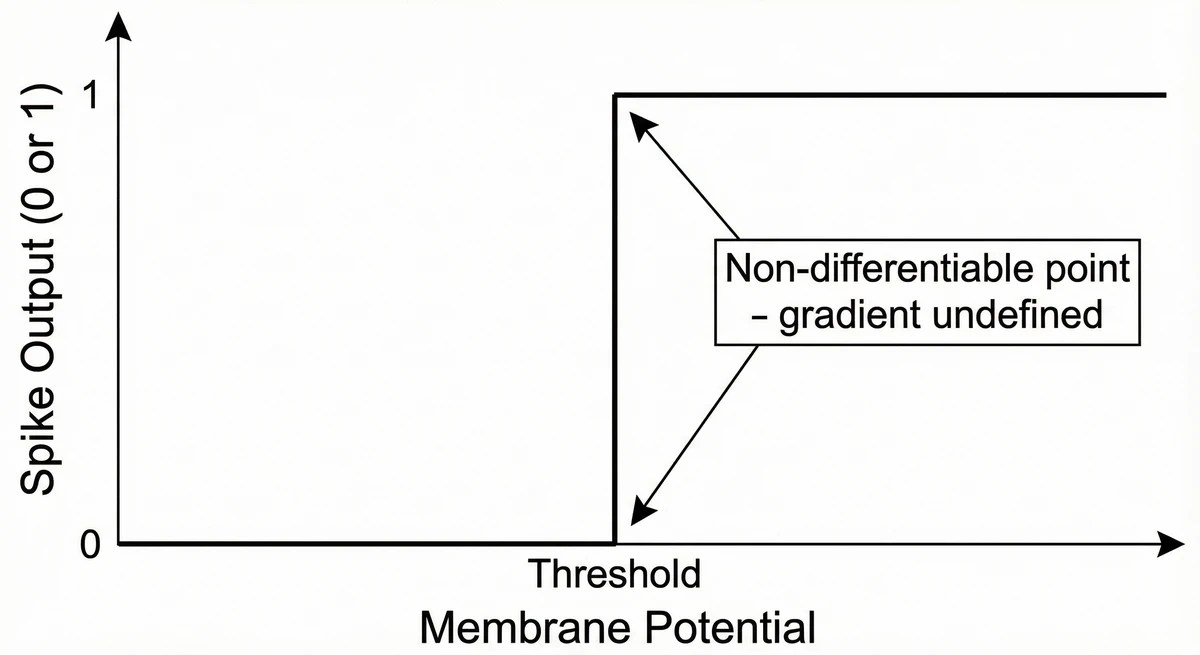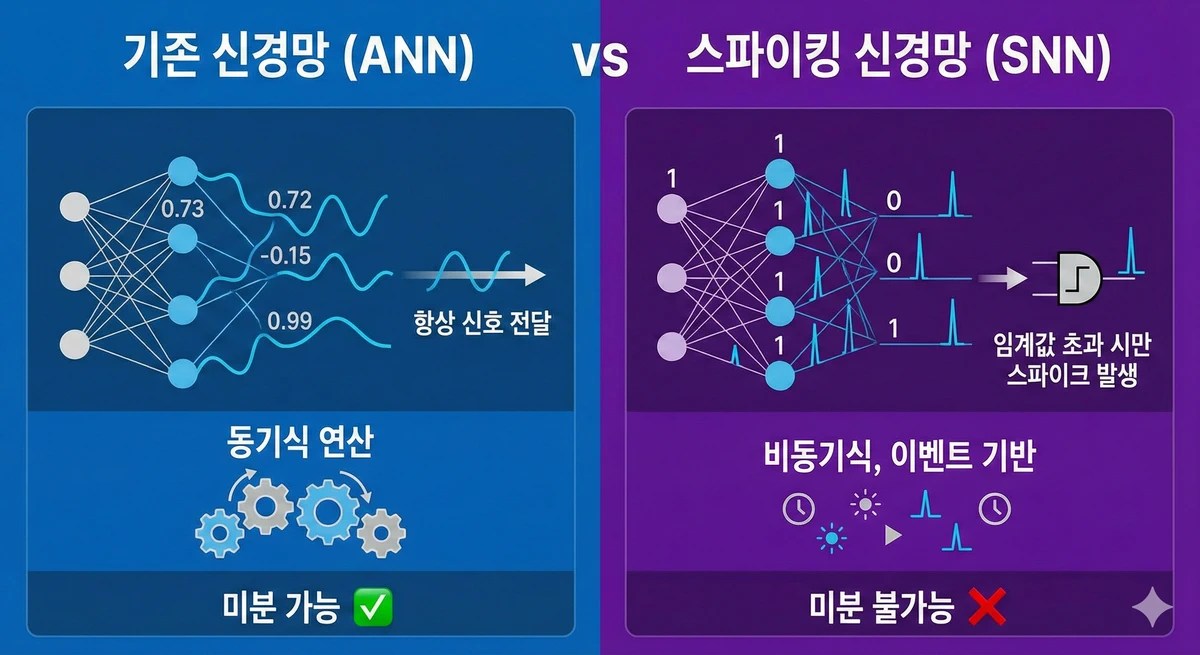 - 뉴로모픽 칩의 비극은 스파이크 신호가 미분 불가능하다는 점에서 시작됩니다. 역전파가 작동하지 않으니 기존 방식으로 학습할 수 없습니다.